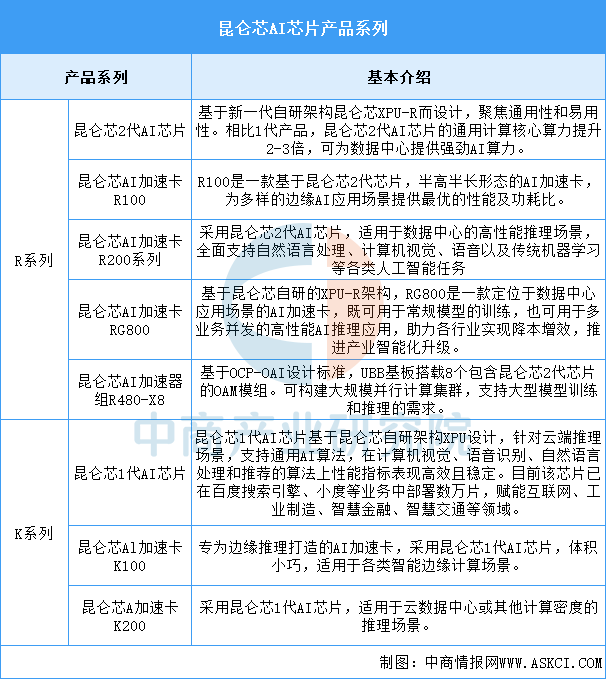 昆侖芯AI芯片可分為R系列及K系列,具體如圖所示: