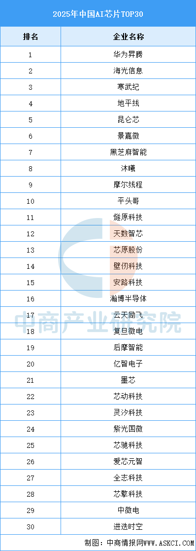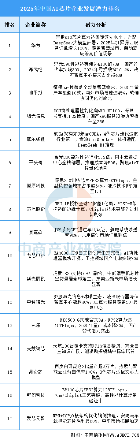 隨著人工智能、自動駕駛、云計算等領域的快速發展,AI芯片企業在訓練、推理、邊緣計算等關鍵領域取得顯著進展,推動中國AI芯片產業的自主可控和高質量發展。2025年中國AI芯片前五企業分別為華為昇騰、海光信息、寒武紀、地平線、昆侖芯。