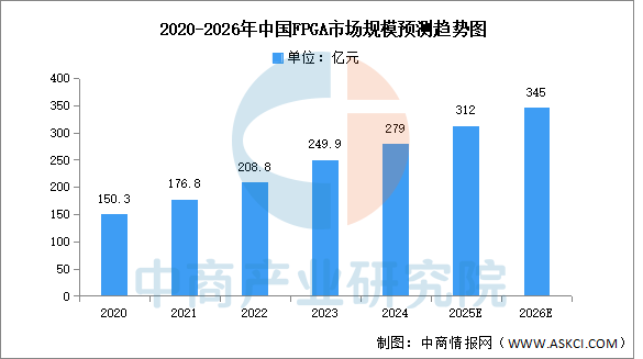 FPGA是一種可編程的集成電路,隨著數據中心建設,人工智能和自動駕駛等新興市場的加速發展,FPGA規模持續增長。中商產業研究院發布的《2025-2030年中國現場可編程門陣列芯片(FPGA芯片)產業調研及發展趨勢預測報告》顯示,2023年中國FPGA市場規模約為249.9億元,較上年增長19.68%,2024年約為279億元。中商產業研究院分析師預測,2025年中國FPGA市場規模將超過300億元,2026年將達345億元。