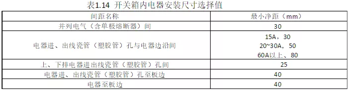 19、配電箱的箱體尺寸應(yīng)與箱內(nèi)電器的數(shù)量和尺寸相順應(yīng),箱內(nèi)電器裝置板板面電器裝置尺寸可依照表1.14肯定;